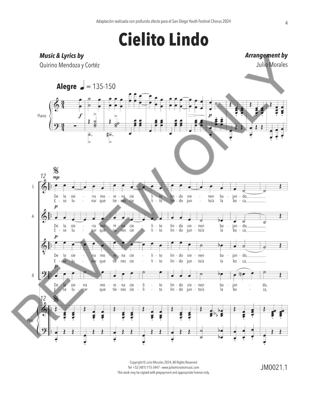 Esta canción fue originalmente arreglada para cuatro voces y piano y estrenada en un festival dirigido por el Dr. Trent Brown en la Bower School of Music & the Arts, de la Florida Gulf Coast University. En ese festival conocí a Cindy Ellis, quien me solicitó realizar una versión para coro mixto y coro infantil, la cual se estrenó en el San Diego Youth Festival Chorus 2024.